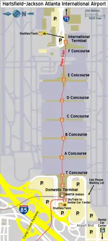 Think of the airport as a series of parallel ribs (concourses) connected by a central spine (the Transportation Mall and Plane Train), bookended by the Domestic and International Terminals. To get between concourses, head to the center of the one you are in, then take an escalator down into the Transportation Mall, the long straight underground hallway that connects everything. You can choose to walk (it's about 1,000 ft (300 m) between each concourse, with moving sidewalks for most of that length), or you can take the much faster Plane Train, an automated people mover that stops at every concourse roughly every 2 minutes. (Did we mention it's fast? Heed the announcements and hold on to something, lest you bowl into the other riders.) You don't have to leave or re-enter secure zones, so tight connections are usually quite feasible.