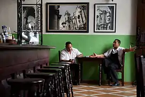 Local bars are not that hard to find despite typically having no prominent signs displayed outside. Just ask or walk around a local neighborhood and look out for a bare-walled, neon-lit run-down room without any decorations or furniture, save for a bar and a few rickety chairs and tables, sullen staff and depressed/bored/drunk-looking customers, almost always men. Contrary to Cuba's reputation as a music and fun loving nation, these places are not boisterous affairs - they are quiet, almost subdued, music is rarely played, and have the charm of third-world railway station waiting rooms.