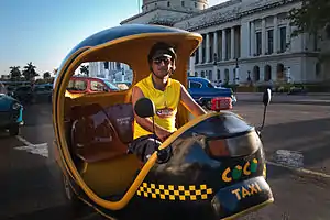 Coco taxis and yellow three-wheel motorbikes are a cheap way of getting around central Havana. Coco taxis are bright yellow motorcycle cabs that charge ~US$0.50/km (2016), or more if they think they can get away with it.