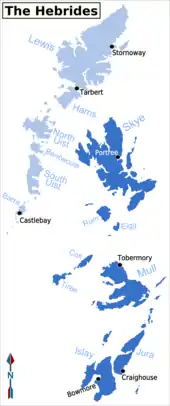 | Outer Hebrides Includes Lewis and Harris, Berneray, North Uist, Benbecula, South Uist, Eriskay, Barra and St Kilda. |