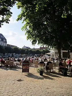 • 🌍 Cafe Chaplin, Kampergade 3 (at Axeltorv), +45 30 53 54 56, . Daily 10:00-16:00. Nice cafe facing the main square in an old half timbered building, has outdoor seating in the front and in the garden patio out back. Employs physically and psychically handicapped people as part of a CSR programme which is a nice touch. Beer 22-58 kr, coffee from 20 kr, brunch 115 kr, mains 65-115 kr.