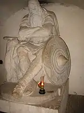 According to legend, Holger or Ogier the Dane, son of King Godfred (king of the Danes 804-810), is a great warrior who served Charlemagne and led his troops to victory against the Arabs, he was then taken to Avalon by the sorceress Morgan le Fay, from where he returns after 200 years to save France. After the battle he walks away, and sits down at his current location in the dungeons below Kronborg to rest, his petrified body only to wake and come into flesh and blood if Denmark is in mortal danger. On that day he will gather all the remaining men of the land, young and old, and fight until blood reaches their knees, victory only assured when there are no more Danes than can be seated around a table, but then peace will last many a year.