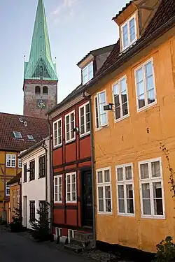 • 🌍 Vor Frue Kloster (Carmelite Priory), Sct. Anna Gade 38, +45 49 21 17 74. Closed to the public except for guided tours. Founded in 1430, and the finest example of a complete monastic complex surviving in Denmark, and one of the best in all of Scandinavia. The Carmelites were invited by the king to enhance education and knowledge in the city, and more importantly care for sick sailors passing through the city. When the order was expelled from Denmark following the reformation, it was turned into a hospital, but thorough restoration works throughout the 20th century have preserved the premises for posterity.