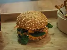 The "Sennen Goroshi" hamburger at Burger Dojo. - 🌍 Burger Dojo, Vuorikatu 14. Mostly 11:30–20:30. A hamburger restaurant in the Fenniakortteli complex near the University of Helsinki metro station, serving hamburgers with Asian flavours. The menu includes beef, pork, chicken, fish, shrimp and vegetarian hamburgers. The restaurant is themed after Asian manga and even the hamburgers are named after manga terms. For a dare, try the Sennen Goroshi extremely spicy hamburger containing Carolina Reaper chili.