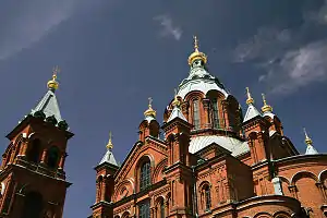 - π Uspenski Cathedral (Uspenskin katedraali), Kanavakatu 1, β +358 9 634267. Tu-F 09:30-16:00, Sa 09:30-14:00, Su 12:00-15:00. May-Sep M W Sa 09:30-16:00, Tu 09:30-18:00, Su 12:00-15:00. A classical onion-domed Russian church prominently located near the Market Square, Uspenski Cathedral serves Finland's small Orthodox minority and is the largest Orthodox church in Western Europe. The name comes from the Russian uspenie, from the Dormition (death) of the Virgin Mary. The five domes are topped with 22-carat gold, and some of the icons within are held to be miraculous. Free.