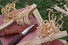 To make a fire in difficult conditions, some of three kinds of tinder is usually available in the forest: dead dry twigs low on spruce trees (only take those easy to snap off – the spruce easily gets infected), birch bark (not bark resembling that of other trees) or resinous pine wood. The three require different techniques, so train somewhere where taking the material does not harm, before having to use them. Using the spruce twigs you need enough of them, with enough fine material, and the right compromise between enough air and enough heat (you might need to use your hands; you should respect the fire but not be frightened). Using birch bark is easy, but check how it behaves. A knife is useful to get it off the wood in bigger pieces. For pine the key is to have fine enough slices. Pine usable as tinder is recognized by the scent at a fresh cut and by it being long dead but not rotten, often as hard parts of an otherwise disintegrated moss covered stump (train your eye!). In the fell birch forests, where there is no dry wood, the birch wood should be split into thin enough pieces, and made extremely thin to get the fire going (thicker firewood can be used to keep mosquitoes at bay, and after it having dried enough). Above the tree line you can use dry twigs, but getting enough dry firewood can be difficult.