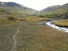 Spring is a much loved season by many locals. Days are light, the sun is strong and nature is awakening. Wilderness hikes can be demanding, with deep snow here and bare ground there, and much water, but many destinations are unproblematic. In the north and in high mountains June is still a time of melting snow and high waters in the streams and in the high mountains snow may persist into July or later. Rotten snow and high waters make hiking difficult in the affected areas in what is early summer elsewhere. Later the remaining snow is often compact, hard enough to walk on.