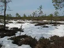 The pine and spruce forests are the westernmost part of the great North Eurasian taiga belt. The taiga belt covers most of Finland and Sweden and parts of Norway (particularly East Norway and some border regions). In lowlands, especially in some parts of Finland and Sweden, there are also vast mires and bogs. The ice age left eskers, which give the landscape a peculiar rolling character in some regions. Much of southern Finland and Sweden were under the sea level when the ice left, and the bedrock is often visible even on low hills, with trees growing where enough soil has accumulated, giving a sparse forest on the hilltops. Except for some regions, only a minor part of the land is farmland. Forest dominate, although much of it is used for forestry, with many clearings. Old forest is found here and there, saved by difficult terrain, and larger areas far enough from roads and rivers.