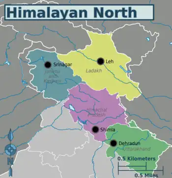 The Himalayan North region comprises the two states and two union territories of India at the northernmost Himalayan mountains: Himachal Pradesh, Jammu and Kashmir, Ladakh and Uttarakhand. Eastern parts of Himalayan India are in the northern sections of Eastern India and North-Eastern India, which have their own regional articles.
