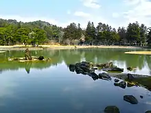 - 🌍 Mōtsu-ji Temple (毛越寺) (10 minutes on foot from the station). The second of Hiraizumi's two large temples, known for its Heian-era Pure Land Garden (浄土園 Jōdo-en) dating to 800 AD. The garden seems downright un-Japanese in its liberal use of wide, grassy spaces — but most of the open spaces have scattered rocks and are marked with small posts in the middle, indicating the locations of destroyed temple buildings. ¥500.