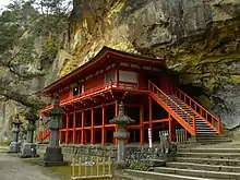 - 🌍 Takkoku no Iwaya Bishamon-dō (達谷窟毘沙門堂) (about 30 minutes bike ride out of town). A nice cave temple. It is the 5th incarnation of the temple since it was established in 801. It is dedicated to Bishamon the god of war, but was called Iwaya Bishamondo — a place to pray for peace. Also at this site is the Ganmen Daibutsu a giant stone carving of Budda, but only the head remains after an earthquake destroyed the body. The ride to the temple is enjoyable in itself with nice Japanese countryside all the way. Ironically, although it is often considered to be the most interesting site for tourists, it is one of the only local attractions that is not a World Heritage Site. ¥300.