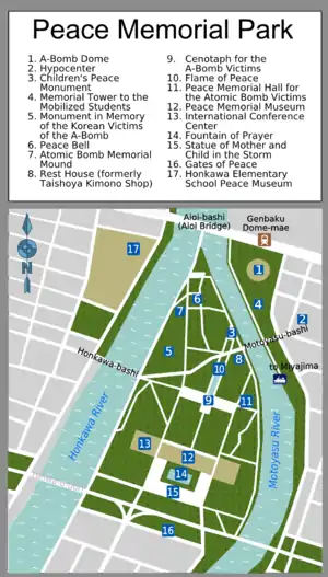 Most of the memorials related to the atomic bomb are in and around the Peace Memorial Park (平和公園 Heiwa-kōen), reachable by tram line 2 or 6 to Genbaku Dome-mae. Coming from JR Hiroshima Station, you'll see the Peace Park on your left just before crossing the T-shaped Aioi Bridge, which is thought to have been the target of the bomb.