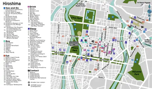 - 🌍 Micchan (お好み焼 みっちゃん総本店), 8-4 Komachi, Naka-ku (Chuden-mae tram stop), ☏ +81 82-248-3022. W-M 11:30-14:30, 17:30-21:30 (Sa Su 17:00-21:30). Reasonably priced okonomiyaki restaurant. There are branches in Hatchobori, Hiroshima Station, Sogo Department Store, Fukuya Department Store and Tokyo. Okonomiyaki \869.