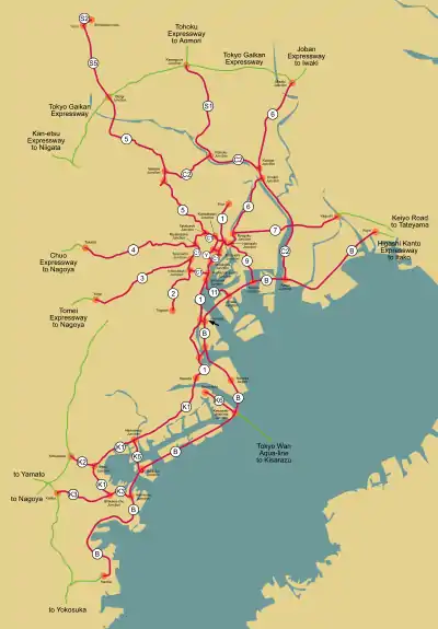 A historical footnote that may help your wrap your head around this warped system: The circular nature of the Tokyo Shuto system is actually derived from Edo's ancient expansionary-focussed spiral town planning and the expressway routes are named after how many towns (区) the semicircular route passes through. As such, larger numbers imply you are further from the centre. Incidentally, major non-expressway routes through Tokyo follow this same system, Kanpachi-dori is circle 8, and the Yamanote train line is in fact circle 5 or 6 or something.