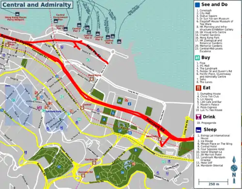 • Mid-Levels (半山區) continue up the escalator to find the high-end residential area half way up Victoria Peak. In the morning the escalator moves residents down the mountain to their offices in Central.