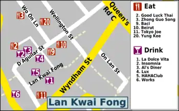 • Lan Kwai Fong (蘭桂坊) a small area just southwest of Central Station focused on the L-shaped street of Lan Kwai Fong and also including parts of D'Aguilar Street, Wellington Street and Wyndham Street forming a square around Lan Kwai Fong. The area is packed with restaurants, bars and clubs. Popular with expats and local drinkers.