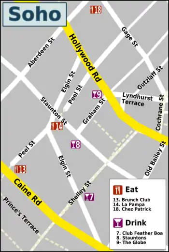 • Soho (荷南美食區) entertainment zone between Hollywood Road and Bonham Road-Caine Road, featuring restaurants, bars, clubs, galleries and shops. Take the elevated walkway from the IFC mall to catch the escalator up.
