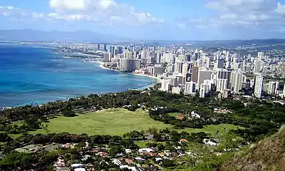 The capital of Hawaii and its primary point of entry, Honolulu is by far the state's largest city, with 980,000 people in the metro area (2018) — two-thirds of the state's population—residing within the metro area. Situated on the southern shore of the island of Oahu, Honolulu serves as the center of government and commerce for the state, the home of the largest airport in the Hawaiian Islands, and the site of the state's best known tourist destination: Waikiki Beach.
