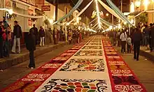 - Night Nobody Sleeps — designs can be fanciful, imaginitive, or dignified and reflective. Each family or artist designs their own carpet panel. On the Night Nobody Sleeps, they sketch it out on the street in a designated frame which is carefully filled with pre-colored sawdust or paper shreds. Tinsel, sparkles and paper adornments are added to flesh out the design. For several hours, the carpets are left undisturbed while people walk the streets, admiring their craftsmanship. Then the parade starts with the procession of the Virgen of the Asuncion. Months of preparation and hours of work disappear as the parade proceeds to trample the carpets.