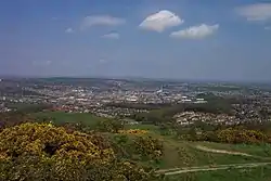 - π Castle Hill. From all around the area, Castle Hill can easily be picked out, crowned with the Victoria Tower, built to commemorate Queen Victoria's silver jubilee. It can be reached by car and taxi, just beyond the suburb of Almondbury, and gives wonderful views in all directions, including that at the top of this article. Victoria Jubilee Tower is open to the public at weekends during the summer.