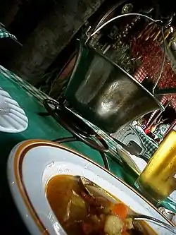 A typical Hungarian meal will involve soup, often like a consommé (erőleves), meat with potatoes (burgonya) and a side salad, and a dessert such as pancakes (palacsinta). A meal is almost always, even at breakfast, accompanied by Hungarian pickles called savanyúság, literally "sourness". These are often dubbed saláta on menus, so order a vitamin saláta if you want fresh vegetables. Starch is most often served as potatoes, rice or dumplings (galuska or nokedli). The primary Hungarian contribution in this field is an unusual type of small couscous-like pasta called tarhonya.