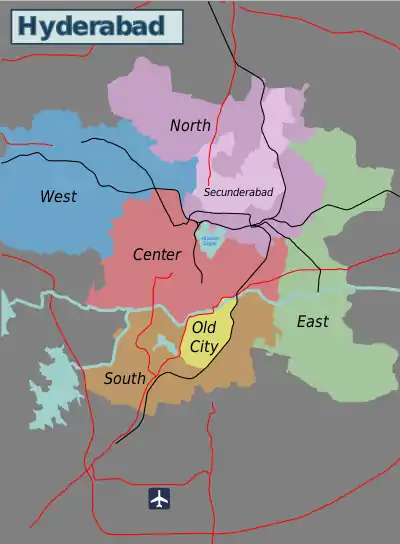 Administratively, Hyderabad is divided into six zones - North, North-East, South, East, West and Central. This article follows these zones, except that the Old City has an article of its own (separate from the South Zone). Locals rarely refer to these zones, but rather to one of dozens of neighbourhoods of which the city is made up.