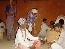 Astrologer foretells a boy's future. Village scene at Shilparamam