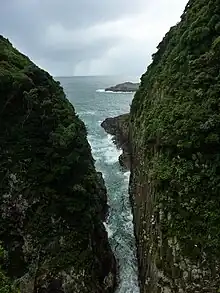 - 🌍 Kurusu no Umi (クルスの海). Kurusu no Umi, or the sea cross, is a place in which the ocean wore the stone away perpendicularly forming a natural cross shape. This overlook offers a great view of the cross and more of the coastline. The rocks aparently split in a way that resembles the character 叶, "come true." The locals say that wishes made here come true, which is why some signs call this place "Sea-Cross – have ones wish granted". It is especially popular for dates, so you may be surrounded by couples.