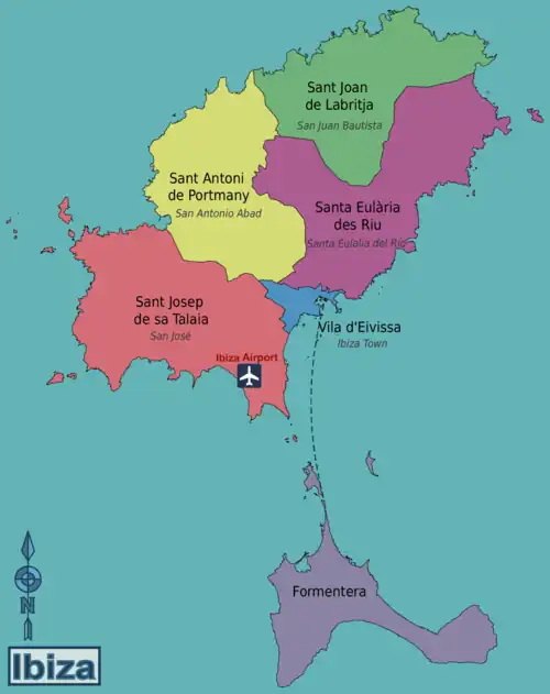 Ibiza has 5 separate municipalities, which are the designated 'regions' of the Island. They are often named after their largest town, with some exceptions.