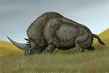 Many species of large animal, which biologists call megafauna, that were common during the ice ages became extinct around the end of those ages, about 10,000 BCE. These included the woolly mammoth, woolly rhinoceros, saber-tooth tiger, and several species of deer and cattle (aurochs) much larger than modern species.
