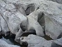 - Glacial potholes: A giant's kettle, also known as either a giant's cauldron (Norwegian: jettegryte), moulin pothole, or glacial pothole, is a typically large and cylindrical pothole drilled in solid rock underlying a glacier.