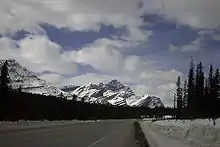 The road runs in the flat of a U-shaped glacial valley climbing from the south and the north ends to its highest point. In the northern section the Athabasca and Sunwapta rivers run north, the southern section the Bow river runs south, and the central section is the source of the Mistaya and North Saskatchewan rivers which flow north then east. The mountains, mainly sandstone but also some limestone rock, rise high on both sides of the road displaying spectacular sedimentary and glacial formations. The ridges of the western mountains form the continental divide.