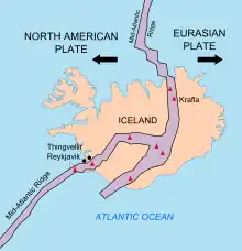 - 🌍 Þingvellir National Park (pronounced "THING-vet-lihr") — A UNESCO World Heritage site. 30 to 50 km (19 to 31 mi) east of Reykjavík. Interesting for a number of reasons: it is the original site of the longest running parliament in the world (the name literally means 'parliamentary fields'), and it's where the North-American and European continental shelf plates are being torn apart.