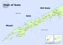 Ikata (伊方町 Ikata-chō) is a town in Ehime. It spans the mountainous Sadamisaki Peninsula, the narrowest peninsula in Japan. Ikata's breath-taking combination of mountain and ocean scenery makes it a wonderful place for a leisurely afternoon drive.