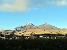 Illiniza is an extinct stratovolcano with two summits; Iliniza Sur (5,248 m above sea level) and Iliniza Norte (5,126 m ASL). It's in the Andean Highlands about 55 km south of the Ecuadorian capital Quito. Administratively the northeastern quarter of the mountain is in the province of Pichincha, and the remainder in the province of Cotopaxi, and the provincial border intersects both summits.