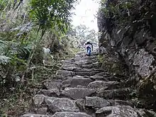 The trail has stairs, most of which were put in by the Incas. The rocks are rough and uneven, and very slippery when wet. It is very easy to sprain your ankle, particularly when descending. Use trekking poles for balance, tread carefully, and be very careful when wet.