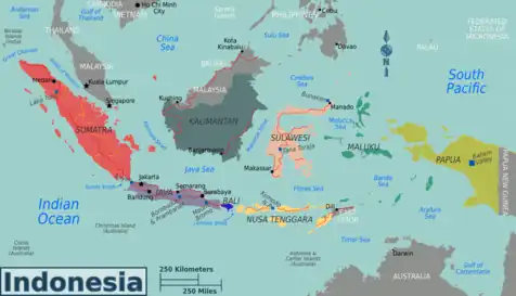 Most of the 37 provinces are composed of a group of smaller islands (East & West Nusa Tenggara, Maluku), or divide up a larger island and its outlying islands into pieces (Sumatra, Kalimantan, Java, Sulawesi, Papua). The listing below follows a simpler practice of putting together several provinces in one region, except with Bali, which is treated as a separate region in Wikivoyage.
