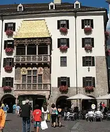 - 🌍 Golden Roof (Goldenes Dachl), Herzog-Friedrich-Straße 15. 24/7. Most famous landmark of the city since 1500, the Golden Roof is a late-Gothic alcove balcony of which the roof is decorated with 2657 fire-gilded copper tiles. It was built to commemorate the wedding of Emperor Maximilian I with Bianca Maria Sforza. The balcony allowed the Emperor and his wife to enjoy festivals, tournaments and other events on the square below. Free.