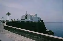 - š The Soccorso's Church. This church is devoted to "Santa Maria della neve" (Saint Maria of the snow), and was built on a steep promontory from which it takes its name. As with the "Torrione" tower, it is the symbol of the town of Forio and it is one of the most original architectural structures on the island. The Soccorso was founded as an Augustinian convent in about 1350 but it was suppressed in 1653, with its present form going back to 1864. The church is accessible by 20 steps of piperno, which leads to a small atrium with five crosses of pipernio. This church is world famous not only for its location but also for its singular faƧade, which is white and adorned by precious 700 majolicas representing saints and scenes of the Passion of Christ. The Soccorso's style is very original, it reassumes some architectures as Greek-Byzantine, Moorish and Mediterranean in harmonic shapes. The inside is very interesting because of the many types of volta. In the left chapel there is a thaumaturgical cross, a sculpture of Catalan inspiration, surely made on the 16th century. Close to this cross there are two marble medals, that were found in a medieval sarcophagus that was found in the castel of the antique cathedral of Ischia. This church retains various artifacts such as a shovel made by Cesare Calise that represents Saint Augustine, and a small basin of pipernio dated from the 9-10th century. On 5 May 2002, during his Pastoral Visit, Pope John Paul II met with many young people in a square adjacent to the church of Our Lady Help of Christians.