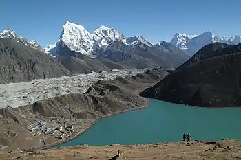 - Gokyo - a 9-day out-and-back high altitude trek from Namche Bazaar through a valley west of Everest Base Camp. This is a less crowded route with good views of Everest. It offers views of Cho Oyu and, below it, the Ngozumpa Glacier which is the largest in the Nepal Himalaya. The Ngozumpa Glacier is the subject of some special research because of its rate of melting and the possible risk to villages down valley. It's possible to climb to a ridge above the village of Gokyo and see four 8,000m peaks: Everest, Lhotse, Makalu and Cho Oyu. There is an impressive ice ridge connecting Cho Oyu and Gyachung Kang (7,922m) that offers one of the most dramatic panoramas in the Khumbu. An alternate route in or out of the Gokyo valley is over the 5,420m Cho La, a high pass connecting west into the Khumbu.