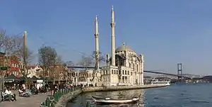 Kabataş Lisesi 150 m; north of Beşiktaş). A neighbourhood on the bank of Bosphorus with the Ortaköy Mosque—the baroque mosque under the Bosphorus Bridge, combination of which are one of the most iconic images of Istanbul. This artsy neighbourhood is filled with nice cafes, some of which offer kumpir—a baked potato with various fillings such as mayonnaise, ketchup, pickles, sweetcorn, sausage slices, carrots, mushrooms, Russian salad among others—which the neighbourhood is well-known for, and a perfect view crowded and fun. The way from Beşiktaş takes around 25 minutes on foot and is along an avenue shaded by huge plane trees, though the usually-heavy traffic may take some of its peacefulness away. - 🌍 (