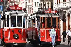 • The Tünel funicular (F2) connects Istiklal Caddesi with Karaköy at the sea level on the Golden Horn. It's the second oldest urban underground railway in the world (after London’s Underground), dating back to 1875. Although the distance travelled is rather short between its two stations (a whopping 573 meters, which perhaps make it also the title winner for being the shortest metro line of the planet), it beats the effort one has to make to climb up the steep slope between its stations. For its lower station, look for the sign Tünel on the side of a building just over the Galata Bridge on the western side of the street. It costs 2.50 TL/person one-way (Istanbulkart is accepted) and departs every 5 minutes M-Sa 07:00-22:30, Su 07:30-22:30.