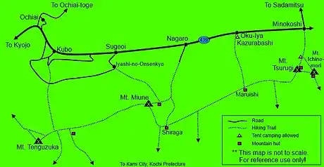 Note: On town maps, local road signs, brochures, and tourism websites the Iya Gorge area is often referred to as simply "Iya Valley" which can lead to confusion as the entire valley all the way up to the base of Mt. Tsurugi should be classified as such. This misnomer is due to translation irregularities.