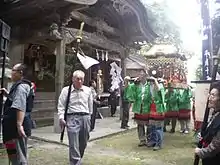 - 🌍 San-jo Jinja (三所神社). This shrine is in the center of Ochiai Hamlet (not along the road, but accessed by walking path from every direction) and the site dates back to the Edo era. Surrounded by towering cedar trees, the doors of the shrine usually remain closed, but the structure is of traditional wooden style and is a calm, cool spot to take a break during a warm summer afternoon. Adjacent to the shrine is a small open field, where twice a year (June 8 and August 5 on the Lunar Calendar, or around early-mid July, and early-mid September) a local festival takes place. Participants wear traditional robes as they carry and throw to one-another long bamboo poles, while children wear traditional face paint and play drums and are pulled around in a covered wooden cart. A special portable shrine weighing about 100 kg (220 lbs) is also brought out and carried on the shoulders of four men. Outside visitors are warmly welcomed (there are usually very few, if any) and may even be asked to partake in the activities. Usually the events start at the shrine about 14:00-15:00 (rain or shine).