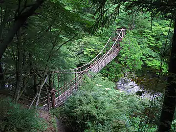 - For considerably more atmosphere and far fewer crowds (if any at all), the Oku-Iya Niju Kazurabashi (奥祖谷二重かずら橋 Deep Iya Double Vine Bridge) can be found at the eastern end of the valley, before the final ascent to Mi-no-Koshi. A short hike down through the forest, you really get the sense of going somewhere hidden. There are two vine bridges here, namely the Husband's Bridge (夫の橋 Otto-no-hashi), the longer, higher up and thus evidently manlier of the two, and on the left the Wife's Bridge (婦の橋, Tsuma-no-hashi). These are a bit closer to the Tarzan kind of vine bridge and best avoided if you have a fear of heights, although even here there are steel cables hidden inside the vines. The surroundings are peaceful and idyllic, and on the other side is an excellent campground and a beautiful waterfall. There is also a small wooden cart that can seat up to three people suspended from rope cables near the Wife's Bridge where you can slide halfway across the ravine before you need to pull yourself the rest of the way with the rope in the cart, though if someone is waiting they often help pull at either end. The river is also easily accessible here, and is refreshing for a cool dip on a hot summer day. Entrance ¥550/adult, ¥350/child. Getting here can be a bit of problem as most buses usually don't come this far (buses only run on weekends, holiday periods, and daily during Golden Week, the summer, and the mid-autumn), but if you have your own transport or a good working thumb, you'll be sure to enjoy the lack of mass access. See Get Around for bus options.