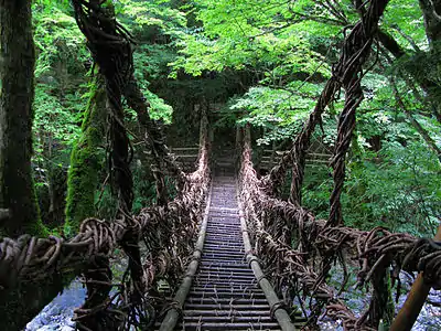One of Japan's Three Hidden Valleys, Iya has dramatic mountain scenery, traditional thatched roof homes, and historic vine bridges. Supposedly a hiding place for the fleeing samurai of the defeated Heike clan from centuries past, the isolation of the Iya valley has a rich history of being a waypoint for wanderers and a place one could go to be away from it all. The valley was raised into the Japanese and Western consciousness by outspoken Japanese-culture conservationist Alex Kerr, whose book Lost Japan (ISBN 0864423705) presented an idyllic picture of a misty valley stuck in a time warp to days gone by.