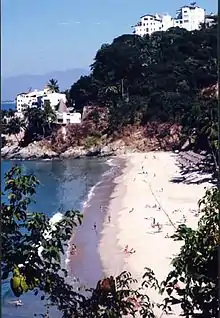 Puerto Vallarta on Banderas Bay has beaches such as Los Muertos, Conchas Chinas, Las Glorias, Mismaloya, Punta Negra and Playa de Oro with large hotels, bars, restaurants and discothèques. This bay was a haven for pirates in the 16th century, but today it is one of Mexico's favored diving destinations because of the range of marine life and an average water temperature of between 24.4 and 30.3 °C. Expert level diving is practiced at Marieta Islands at the edge of the bay. On land, one major attraction is the Puerto Vallarta's nightlife, which is a big draw for LGBT visitors. Ecotourism and extreme sports such as bungee jumping and parasailing are available.