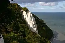 Chalk cliff on the Baltic Sea Coast. Inland forests in a swampy landscape with many small dells and lakes.
