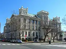 - π Jersey City City Hall, 280 Grove St. (ride the PATH to Grove Street station, then walk south on the street of the same name). Completed in 1896, this imposing granite and marble municipal structure was designed by Lewis Broome, who also designed the Trenton Statehouse. A bronze memorial monument by Philip Martiny stands in the small plaza in front of the City Hall entrance. The memorial bears the inscription: "Erected by the People of Hudson County to Commemorate the Valor of the Soldiers, Sailors, and Marines of the Civil War." The statue is of the Goddess of Victory in a seated pose. Although she has lain aside her shield, her hand rests in readiness upon her sword, though she offers the olive branch of peace.