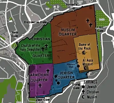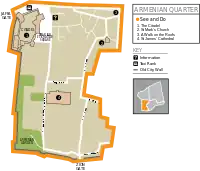 | Armenian Quarter Located in the southwestern part of the Old City. It is the smallest of the four quarters and has the smallest number of residents. Most of the quarter consists of a closed-off private area owned by the Armenian monastery and surrounded by walls. |